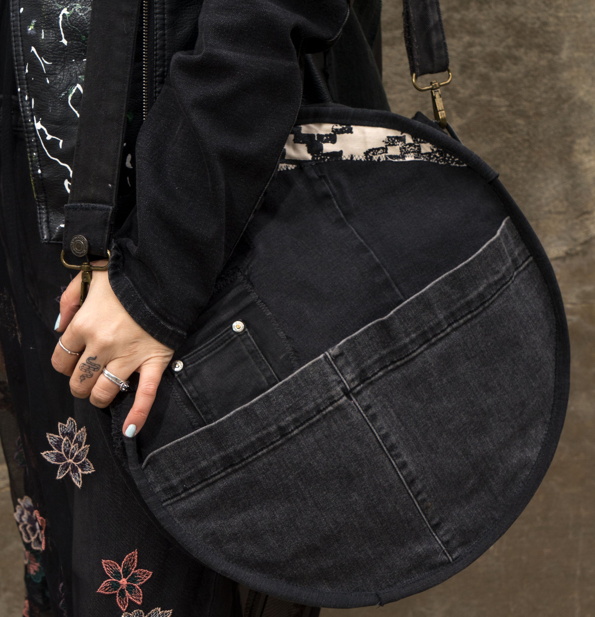 This upcycled denim circle bag will be completely unique to you as each one will be a little different. Fun rounded shape with button fly closure.
