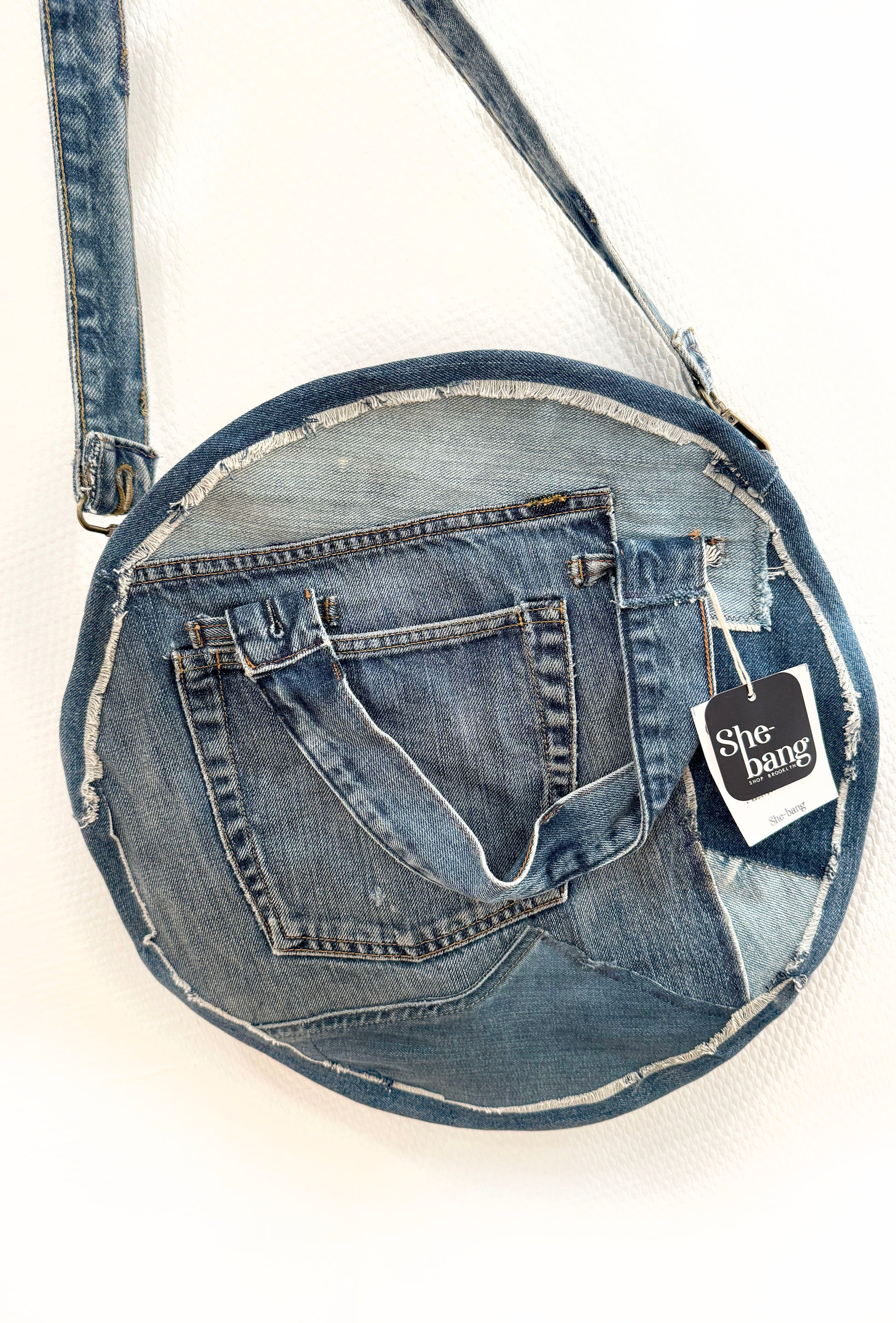 This upcycled denim circle bag will be completely unique to you as each one will be a little different. Fun rounded shape with button fly closure.