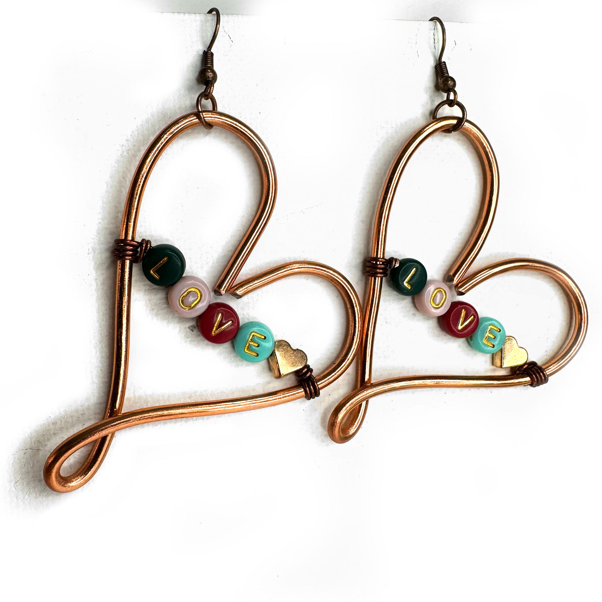 Wear your heart on your ears with our Hearts of Love Earrings! Hand shaped of light weight copper colored wire and colorful beads, these unique handmade pieces are a playful and quirky. Be bold and show the world your love with these fun statement earrings .