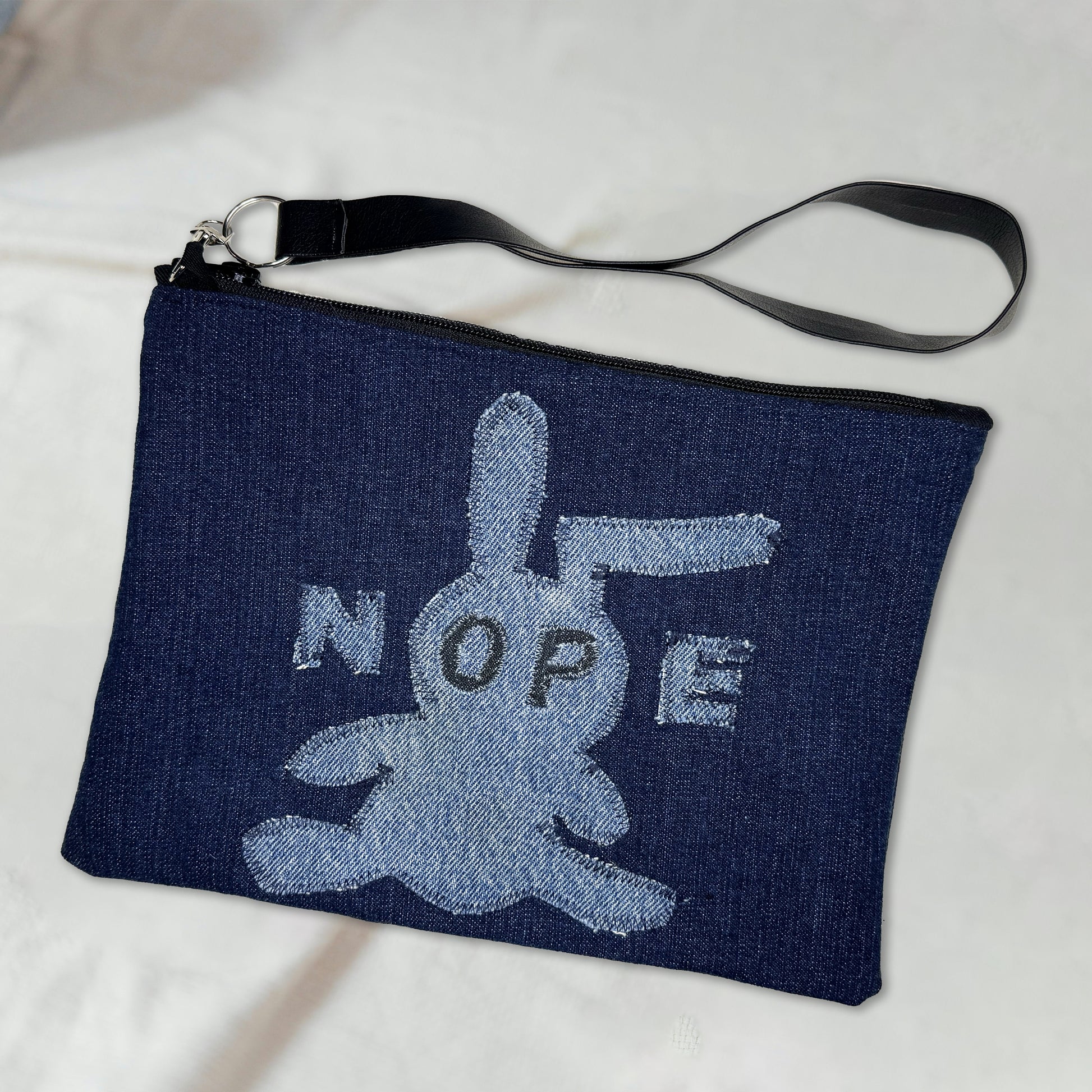 Unleash your playful side with the Nope Bunny Denim Bag. Made from recycled denim, this fully lined bag features a detachable strap and a quirky bunny applique that says "nope". It's handmade and perfect for adding a fun twist to your outfit.