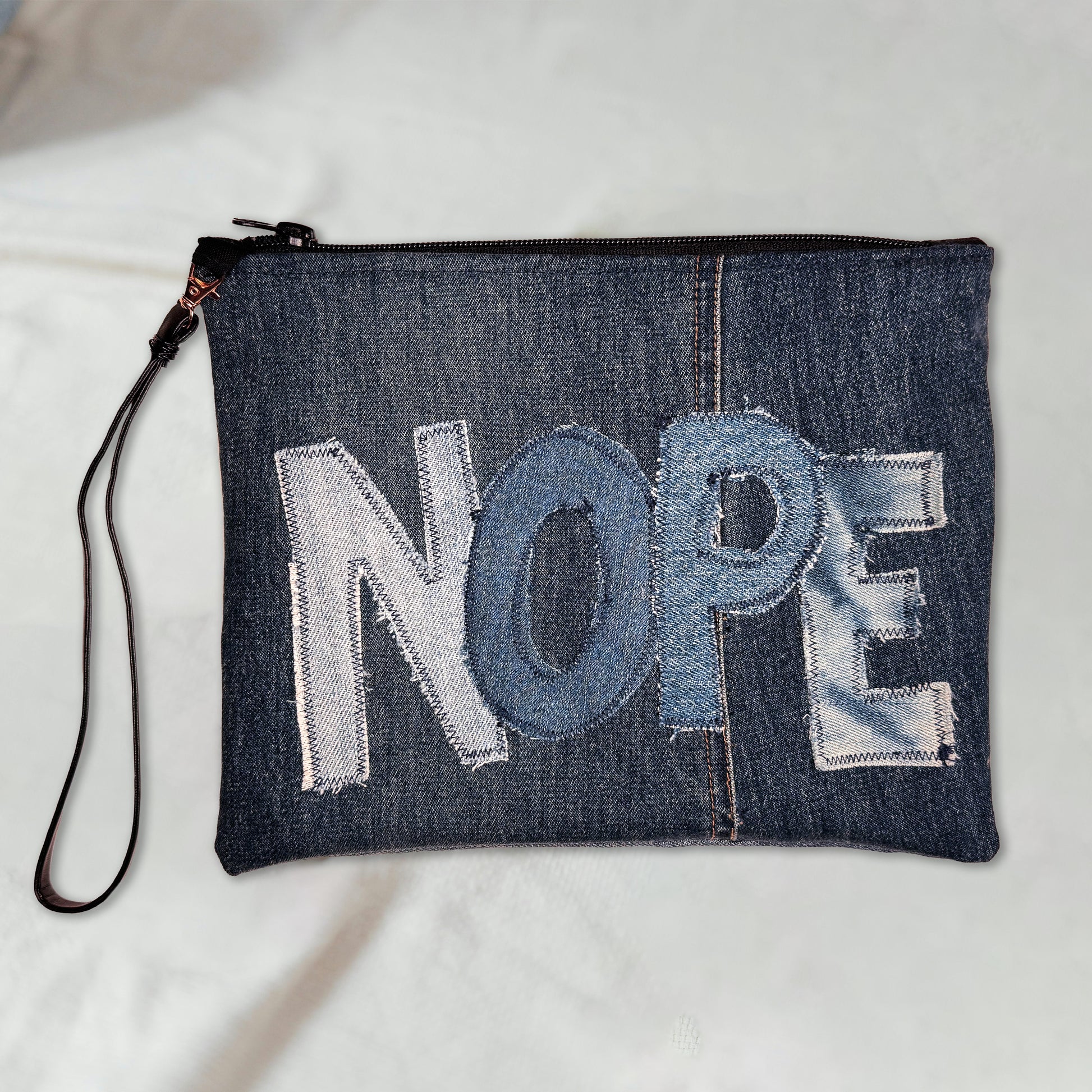 Say nope to boring bags with the Nope Denim Bag! Handmade with all recycled denim, each bag features a unique appliqued nope using different denim washes. And with a detachable strap, it's versatile for any occasion. No two bags are the same, adding to its quirky charm!