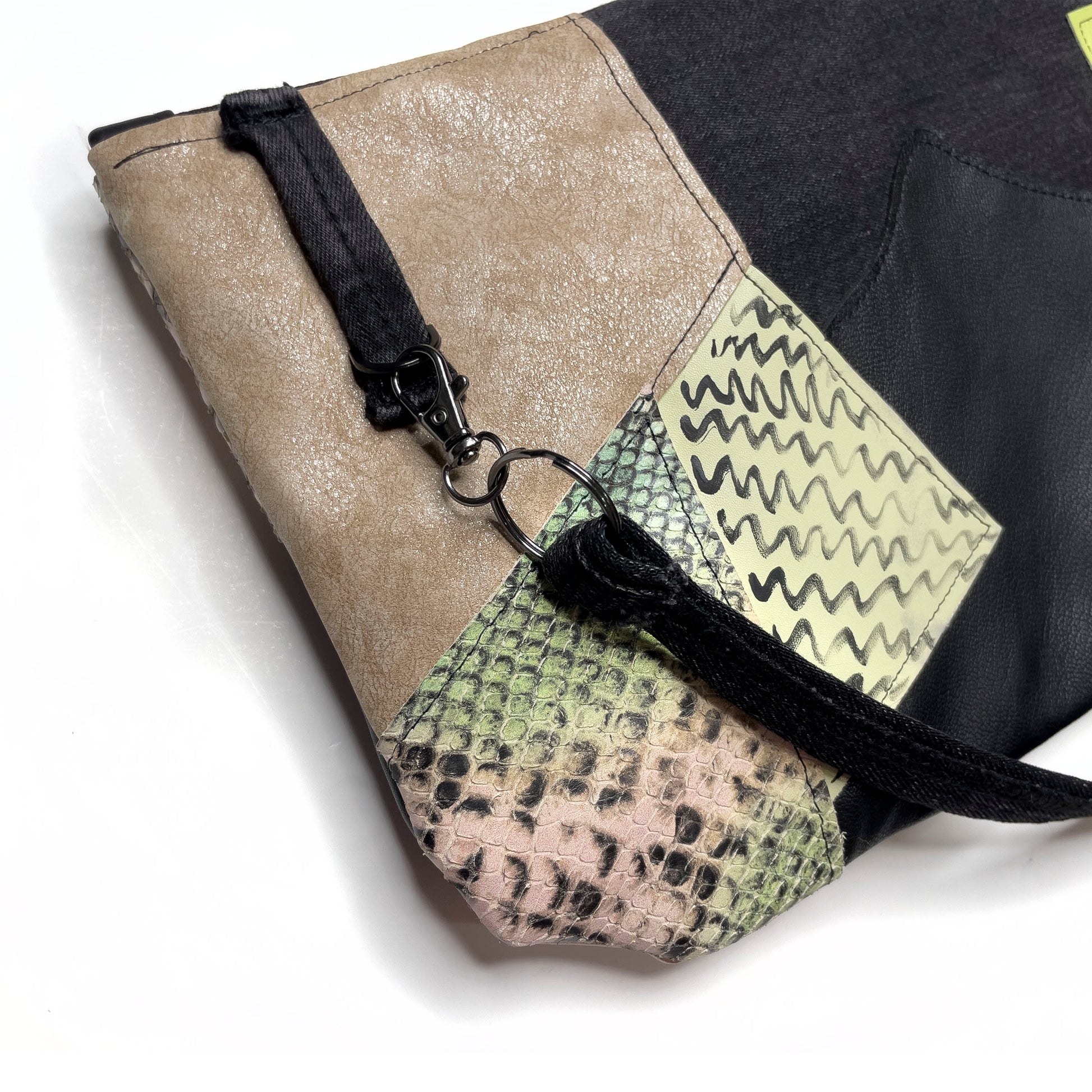 - Upcycled genuine leather, denim and trims