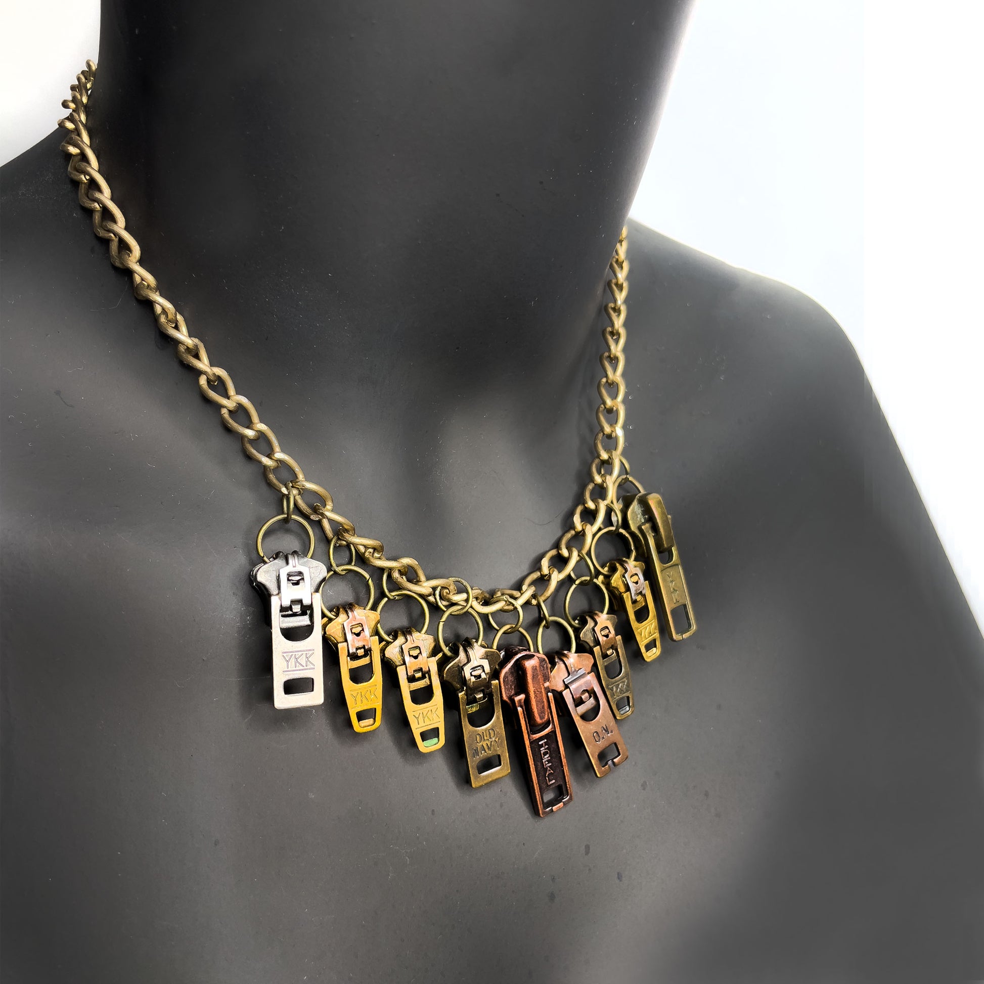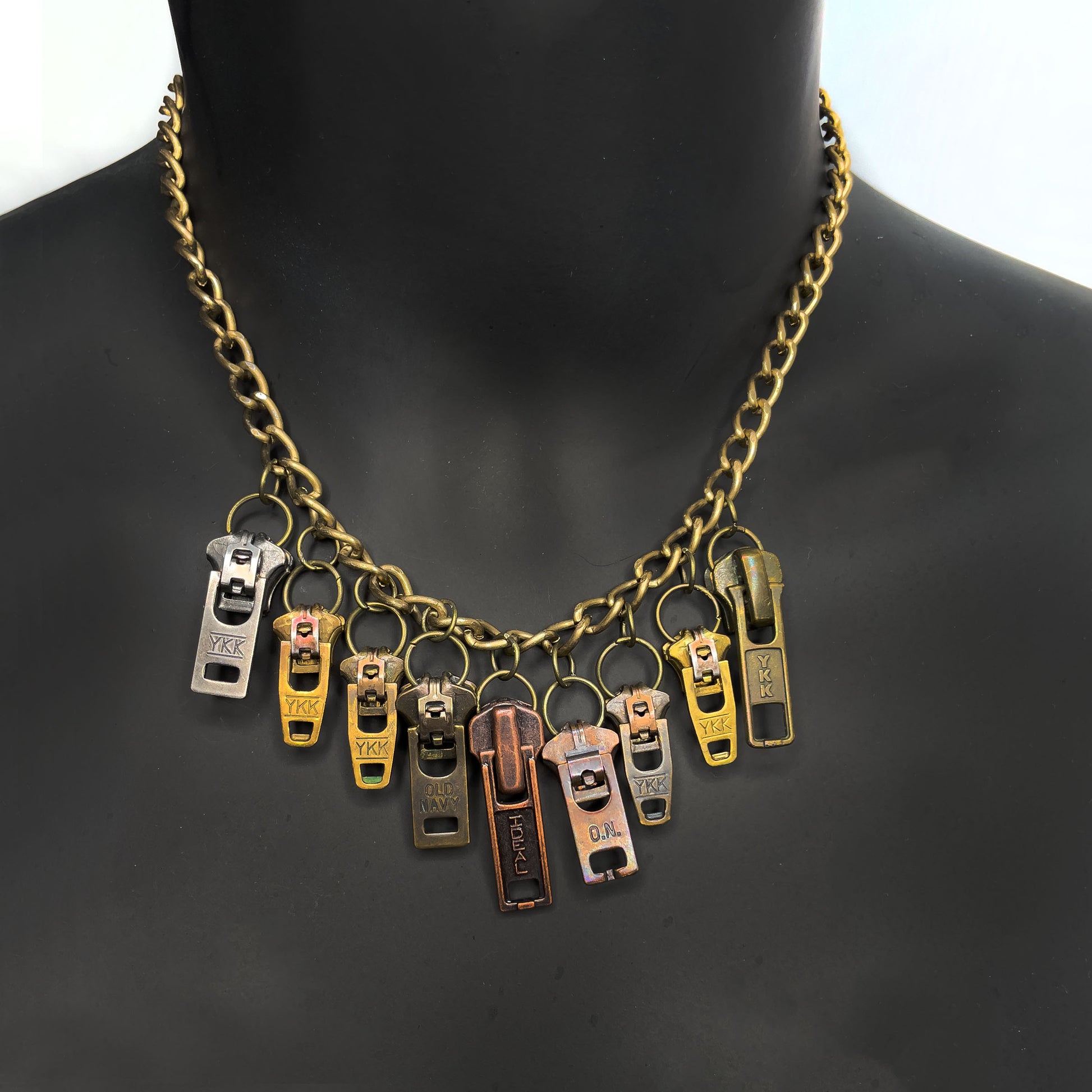 Add a little zip to your everyday style with this handmade one-of-a-kind zipper necklace! Crafted from repurposed zippers we salvaged from upcycled denim blue jeans, this 16" unique statement piece features lots of bronze zippers adorned on a lightweight chain. A fun conversation statement necklace!