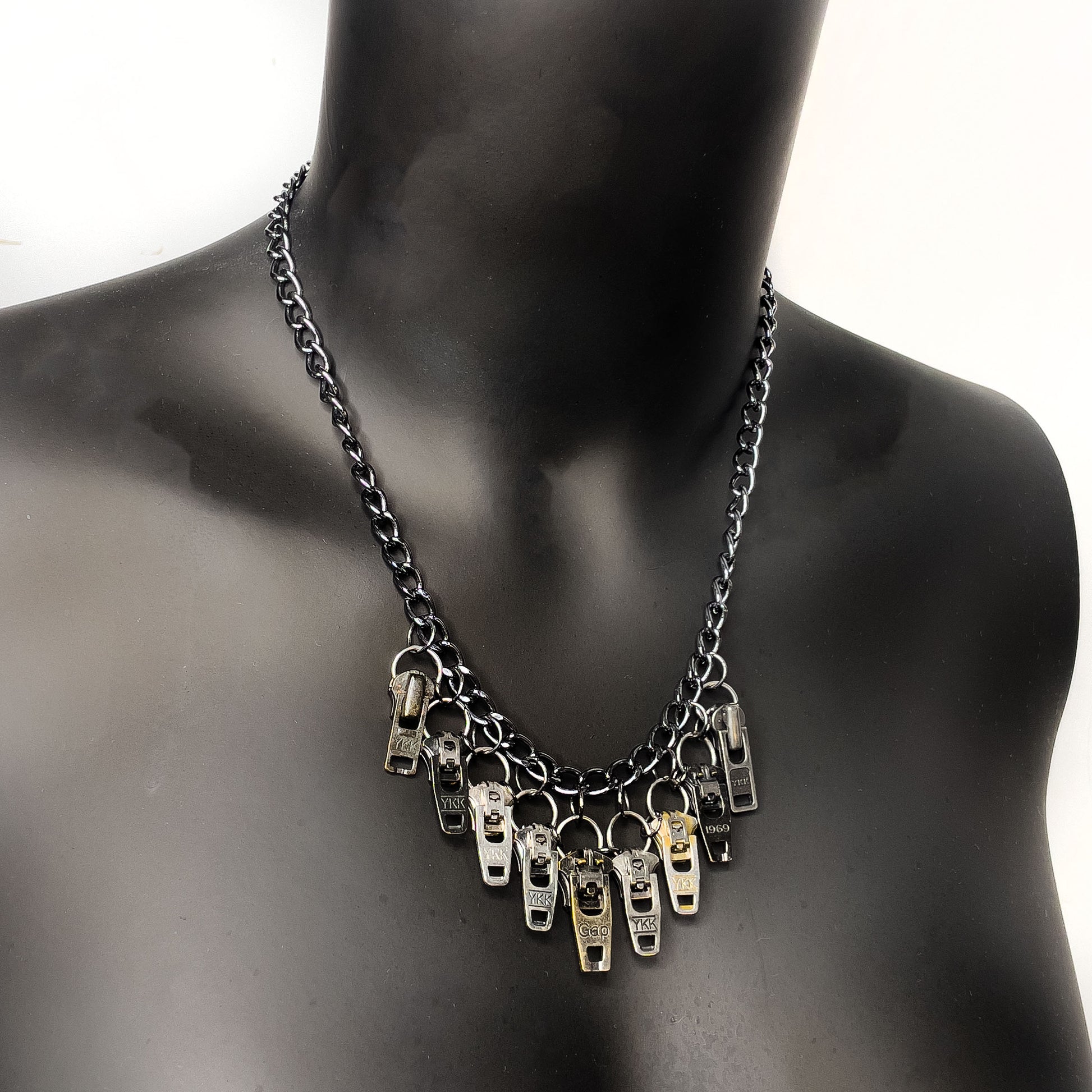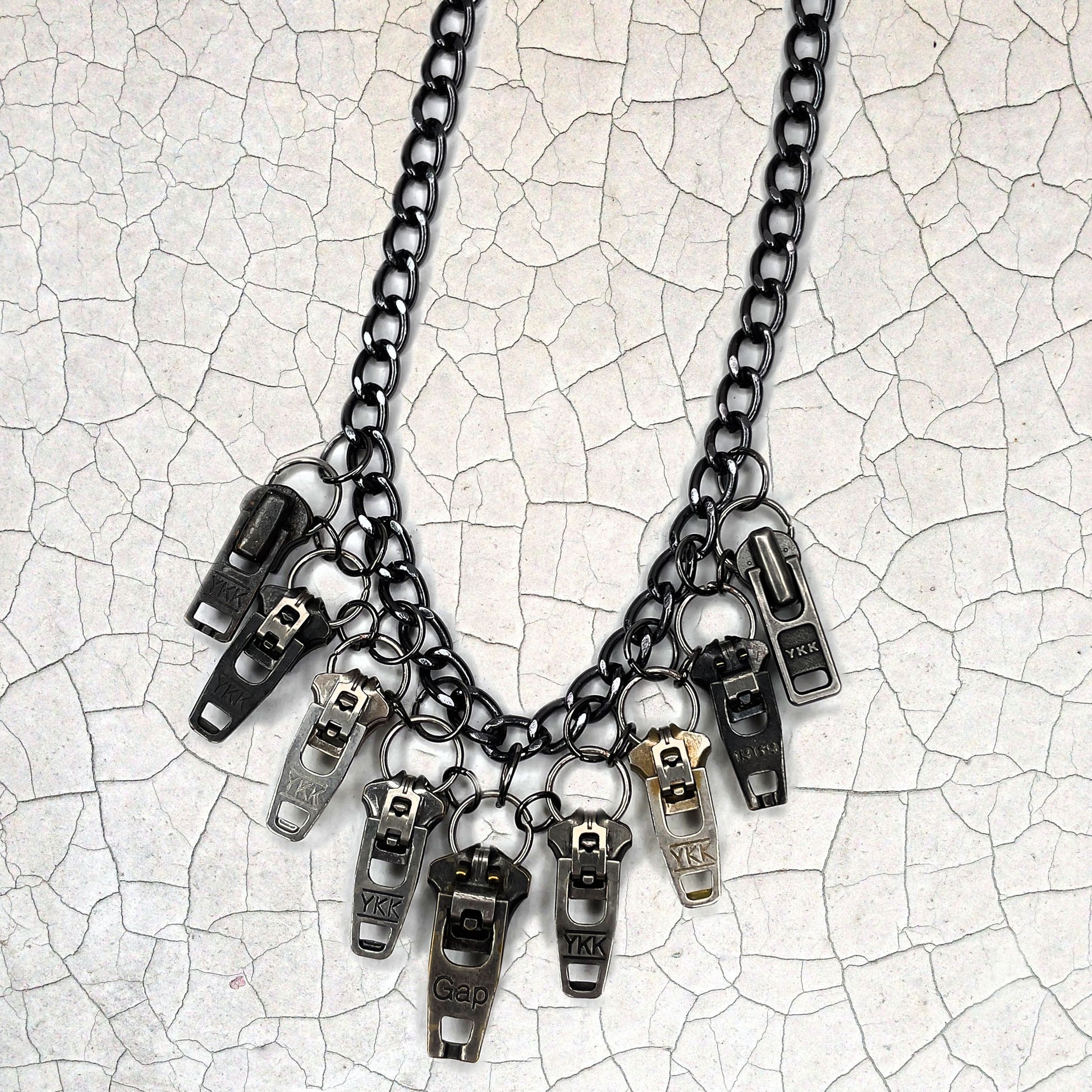 Add a little zip to your everyday style with this handmade one-of-a-kind zipper necklace! Crafted from repurposed zippers we salvaged from upcycled denim blue jeans, this 16" unique statement piece features lots of silver zippers adorned on a lightweight chain. A fun conversation statement necklace!